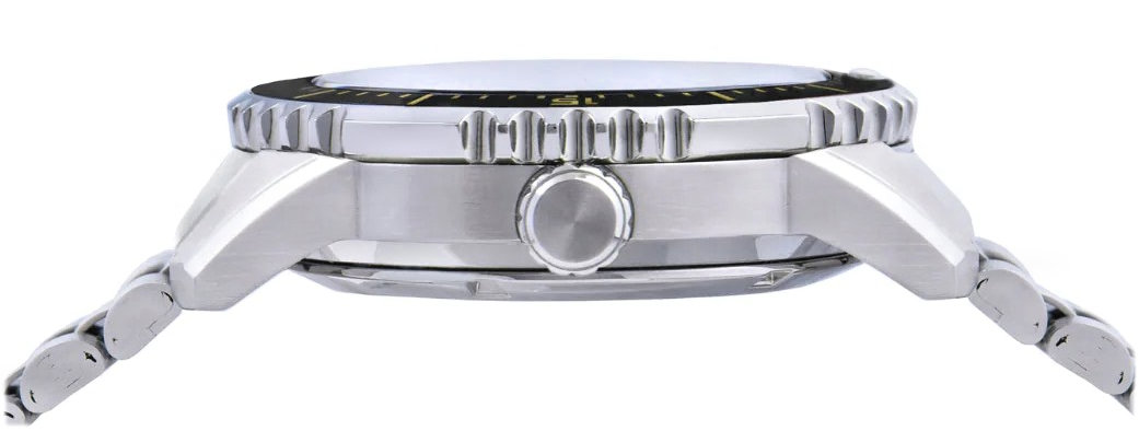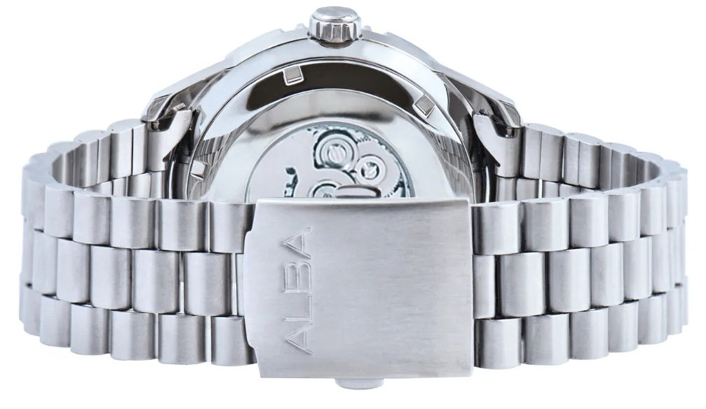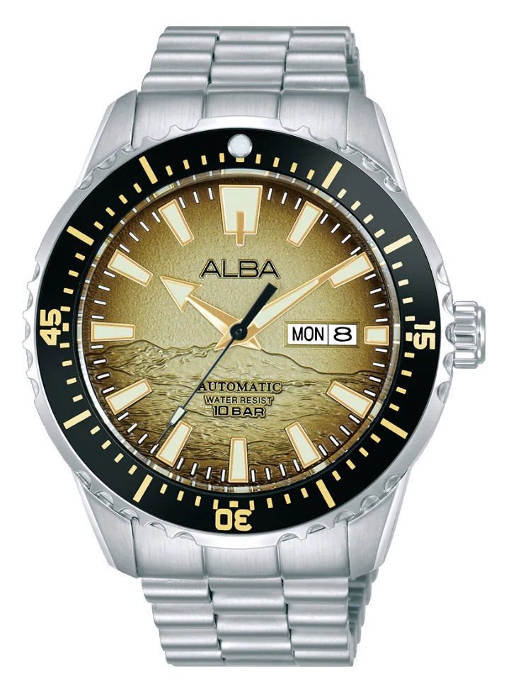 ALBA Active 100M Automatic AL4733X Caliber: Y676 SEIKO 7S26 Automatic Movement, 21 Jewels Made in Japan A window at the 3 o'clock hour reveals the automatic day calendar. Metal: Stainless steel, screw see-through case back Two way rotating bezel Band: Stainless Steel bracelet Water resistance : 100m / 10bar Glass: Hardlex crystal Size: 44.5mm Case Thickness: 13.22mm Band width: 22mm Dial: Light champagne gradation dial Lumibrite on indexes & hands One year International warranty