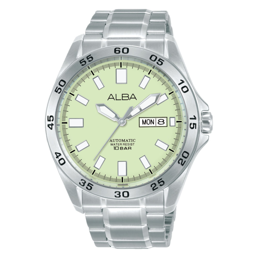 ALBA active 100M Automatic AL4755X1 Caliber: Y676 SEIKO 7S26 Automatic Movement, 21 Jewels Made in Japan A window at the 3 o'clock hour reveals the automatic day calendar. Metal: Stainless steel, screw see-through case back Band: Stainless Steel bracelet Water resistance : 100m / 10bar Glass: Hardlex crystal Size: 43mm Case Thickness: 13.02mm Band width: 22mm Dial: Luminous One year International warranty