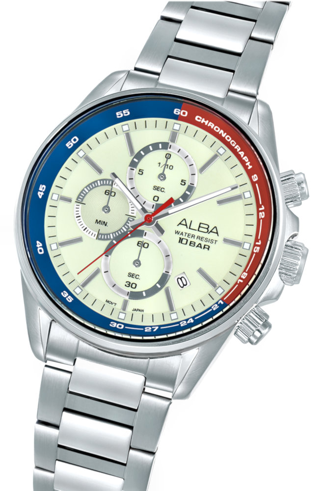 ALBA Active 100M Quartz Chronograph AM3A53X1 Caliber: SEIKO SII Epson VD57 Quartz Movement 60 minute chronograph accurate to 1/10th second Split time Metal: Stainless steel Band: Stainless Steel bracelet Water resistance : 100m / 10bar Glass: Hardlex crystal Size: 44.5mm Case Thickness: 11.58mm Band width: 22mm Dial: Luminous One year International warranty