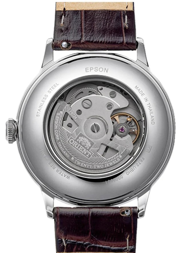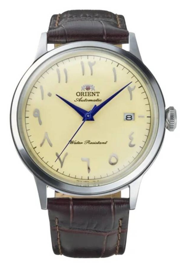 ORIENT Bambino Arabic series Automatic RA-AC0039Y30B Specifications Mechanical Movement: ORIENT NEW caliber F6724 Made in Japan Self-winding & Hand-winding movement 22 jewels 21600/hour vibrations Second hand halt mechanism Stainless steel case Screw caseback lug Size: 21mm Water resistant: 30m Size: 40.5mm Thickness: 12.3mm Band: Leather Strap Glass: Convex crystal glass Dial: Khaki