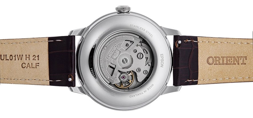 ORIENT Bambino Sun & Moon Automatic RA-AK0805E Mechanical Movement: ORIENT caliber F6B24 Made in Japan Self-winding movement / Hand-winding movement 22 jewels 21600/hour vibrations Second hand halt mechanism Case: Stainless steel See thru case back - Crystal glass Size: 41.50 mm Thickness 13.0mm Water resistant 30M / 3 bar Band: Leather Strap Band width: 21mm Glass: Inorganic crystal glass Dial: Jade Gtreen One year International warranty