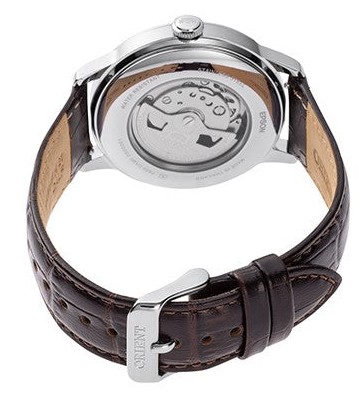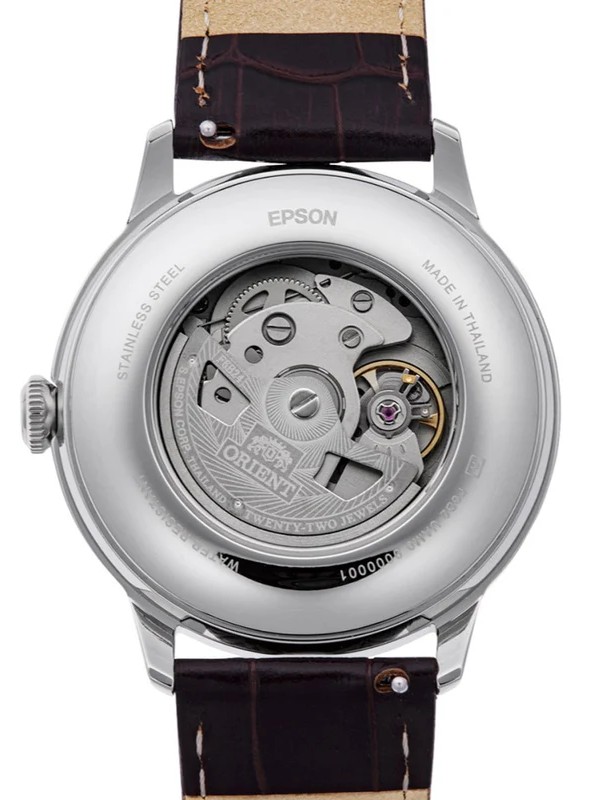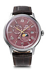 ORIENT Bambino Sun & Moon Automatic RA-AK0807R Mechanical Movement: ORIENT caliber F6B24 Made in Japan Self-winding movement / Hand-winding movement 22 jewels 21600/hour vibrations Second hand halt mechanism Case: Stainless steel See thru case back - Crystal glass Size: 41.50 mm Thickness 13.0mm Water resistant 30M / 3 bar Band: Leather Strap Band width: 21mm Glass: Inorganic crystal glass Dial: Maroon One year International warranty