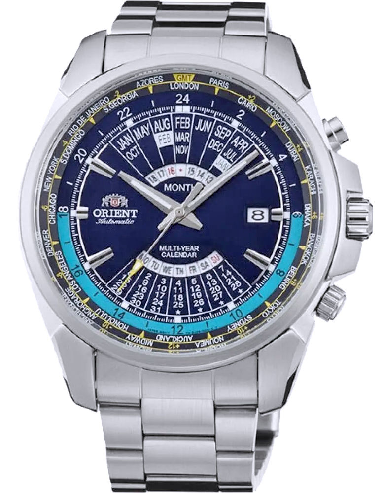 ORIENT Sporty Automatic World-Time Multi-Year Calendar EU0B002D Functions: date, day, year, month, whole month calendar up to 2036 Crown at 2 o'clock position: Year and Day setting Crown at 3 o'clock position: Hour and Date setting Crown at 4 o'clock position: To rotate inner ring/ World-Time Continuous Operation Time: more than 40 hours Metal: Stainless Steel Case Bezel: Inner rotating bezel World-Time Case Diameter: 45mm Movement: Automatic Caliber: Orient in-house movement, Made in Japan Stainless steel bracelet with 2 pushed-in buttons clasp. Glass: Hardlex crystal Luminous hands and hour markers Water resistance to 100 meters/ 10 bars Dial: Blue
