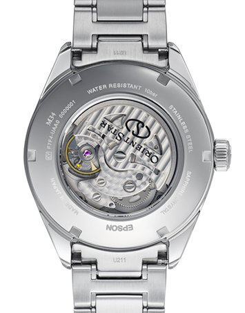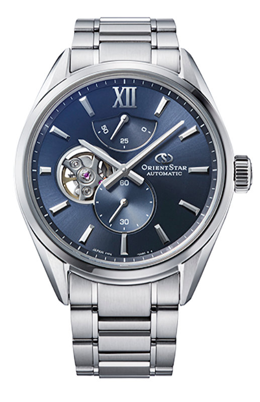 ORIENT STAR Contemporary Open Heart RE-BY0010L Specifications Mechanical Movement : ORIENT caliber F7F44 Made in Japan Self-winding & Hand-winding movement 24 jewels 21600/hour vibrations Accuracy + 25 seconds to -15 seconds 50 hours Power reserve Second hand halt mechanism Stainless steel case (SUS316L) Stainless steel Bracelet Sapphire crystal with anti-reflection coating Screw see-through caseback with Inorganic glass Water resistant to 10bar Case: 40 mm Lug side 20 mm Thickness 13 mm Weight : 149g Dial: Blue