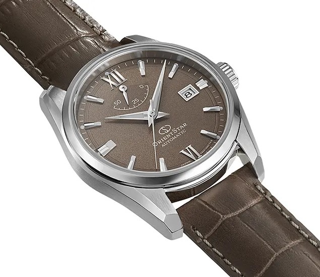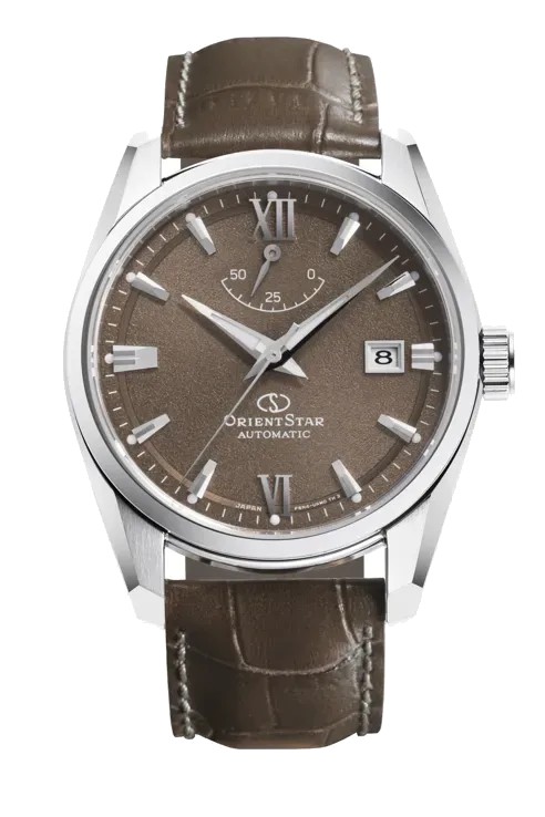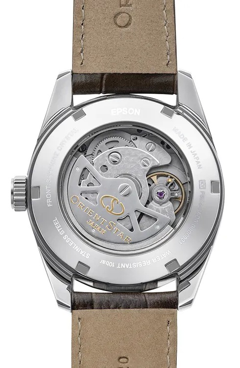 ORIENT STAR Contemporary RE-AU0113Y Engineered for the connoisseur of aesthetic simplicity, the Power Reserve Series is assured through a power reserve indicator that indicates the watch's remaining power. Mechanical Movement: ORIENT caliber F6N43 Made in Japan Drive system: Self-winding movement with Hand winding mechanism (Second hand halts mechanism) 22 jewels, 21600/hour vibrations Running time: More than 50 hours Case: Stainless steel (SUS316L) Screw see-through caseback (Inorganic glass) Band: Leather / trifold deployant buckle with push button Lug Size :20MM Water resistant: 100 m Size: 38.5 mm Tickness 12.3 mm Weight: Glass: Sapphire crystal (Anti-reflective coating) Dial: Beige