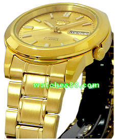 SEIKO 5 Classic Automatic SNKK20K1 Caliber: 7S26 Automatic Movement, 21 Jewels Made in Japan A window at the 3 o'clock hour reveals the automatic day calendar. Metal: Gold Plated stainless steel Size: 40mm with crown Band: Gold Plated stainless Steel bracelet Water resistance Glass: Hardlex crystal Luminous hands Dial: Golden One year International warranty