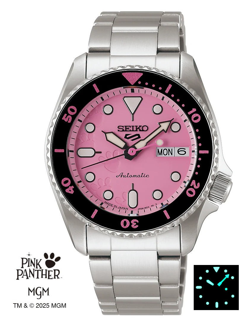 SEIKO 5 SKX PINK PANTHER Limited Edition 9,999pcs Mid Size Automatic SRPM07K1 Caliber: NEW 4R36 Automatic winding type with manual winding mechanism 24 Jewels Made in Japan Power Reserve : Approx. 41 hours A window at the 6 o'clock hour reveals the automatic day calendar. Screw case back See-through case back Serial number engraved on the case back Unidirectional rotating bezel Metal: Stainless steel Size: 38mm Thickness: 12.1mm Weight : 140g Band:Stainless steel bracelet Case SizeThickness: 12.1mm Diameter: 38.0mm Lug-to-lug: 44.2mm