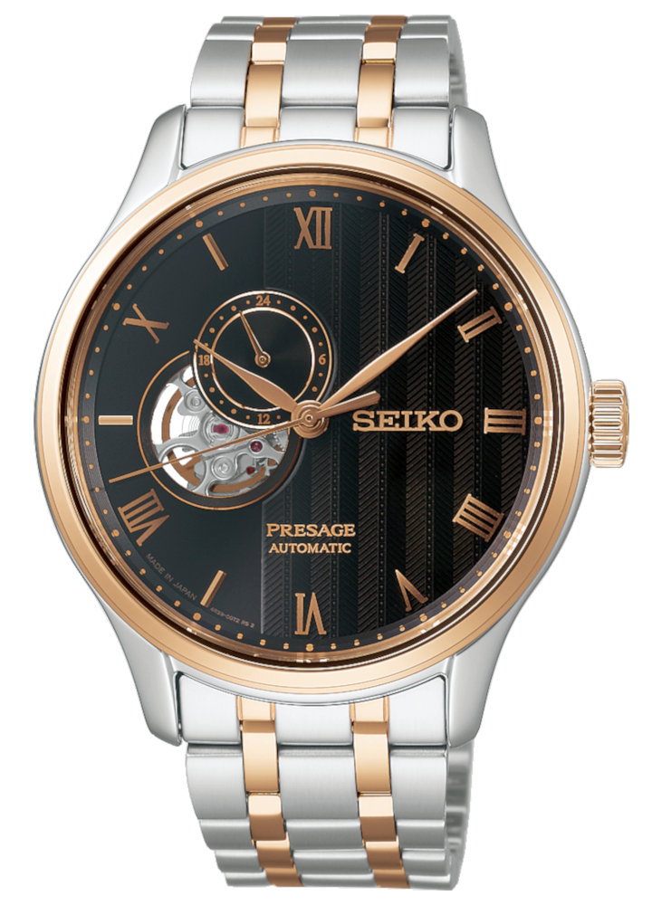 SEIKO PRESAGE ZEN GARDEN Kyoto Autumn Leaves Open heart Automatic SSA466J1 Caliber 4R39 Vibrations: 21,600 vibrations per hour (6 beats per second) Power reserve: 41 hours Number of jewels: 23 Specifications Stainless steel case Box-shaped Hardlex crystal Screw see-through case back Diameter: 41.8mm, Thickness: 11.8mm Water resistance: 5 bar Magnetic resistance: 4,800 A/m Band: Stainless steel Band Reference: Dial: Black