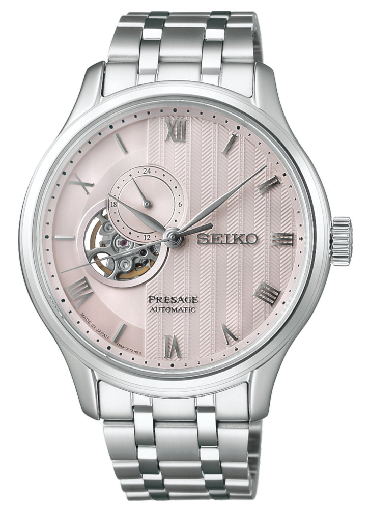 SEIKO PRESAGE ZEN GARDEN Kyoto Cherry Blossom Open heart Automatic SSA465J1 Caliber 4R39 Vibrations: 21,600 vibrations per hour (6 beats per second) Power reserve: 41 hours Number of jewels: 23 Specifications Stainless steel case Box-shaped Hardlex crystal Screw see-through case back Diameter: 41.8mm, Thickness: 11.8mm Water resistance: 5 bar Magnetic resistance: 4,800 A/m Band: Stainless steel Band Reference: Dial: Pink