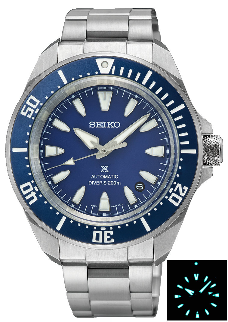 SEIKO PROSPEX New Samurai Diver's 200M Automatic SRPL51K1 Specifications - Caliber: 4R35 Automatic winding type with manual winding mechanism 23 Jewels Made in Japan A window at the 4.5 o'clock hour reveals the automatic day calendar. Metal: Stainless steel Size: Diameter: 41.7mm Thickness: 12.3mm Weight: 170g Band: Stainless steel Three-fold clasp with secure lock , push button release with extender Water resistance: 200 meters/ 20 bars Glass: Hardlex crystal Dial: Blue Three years International warranty