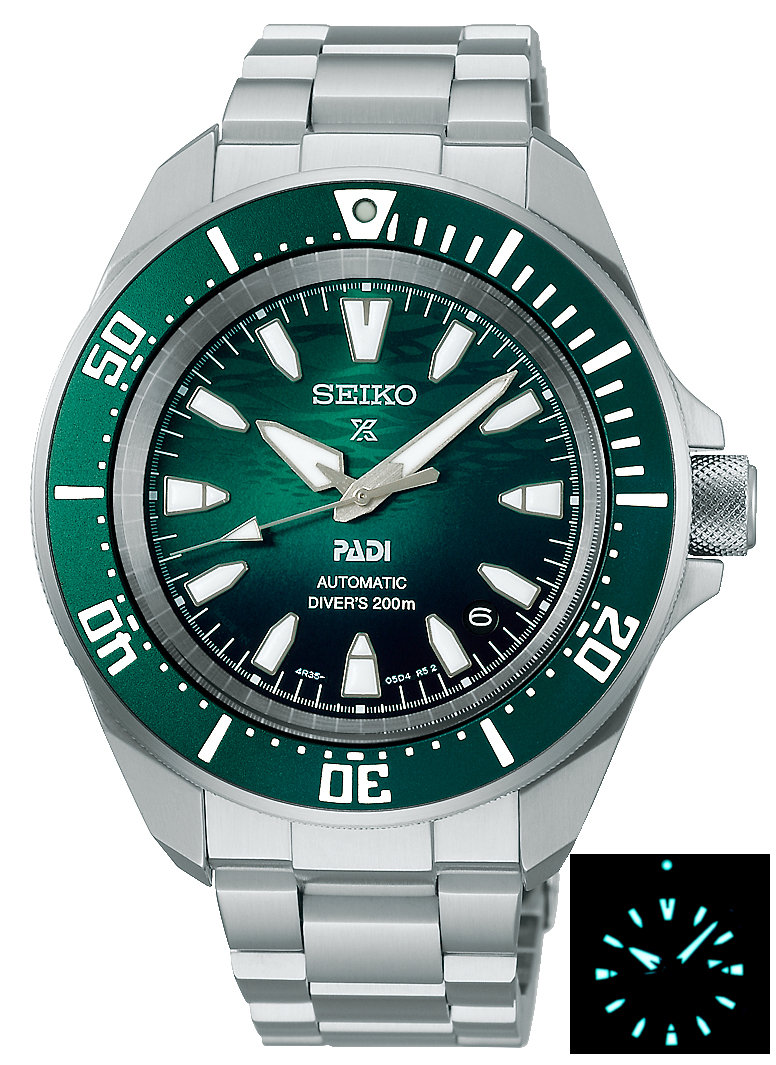 SEIKO PROSPEX New Samurai PADI Diver's 200M Automatic SRPL53K1 Specifications - Caliber: 4R35 Automatic winding type with manual winding mechanism 23 Jewels Made in Japan A window at the 4.5 o'clock hour reveals the automatic day calendar. Metal: Stainless steel Size: Diameter: 41.7mm Thickness: 12.3mm Weight: 170g Band: Stainless steel Three-fold clasp with secure lock , push button release with extender Water resistance: 200 meters/ 20 bars Glass: Hardlex crystal Dial: Green Three years International warranty